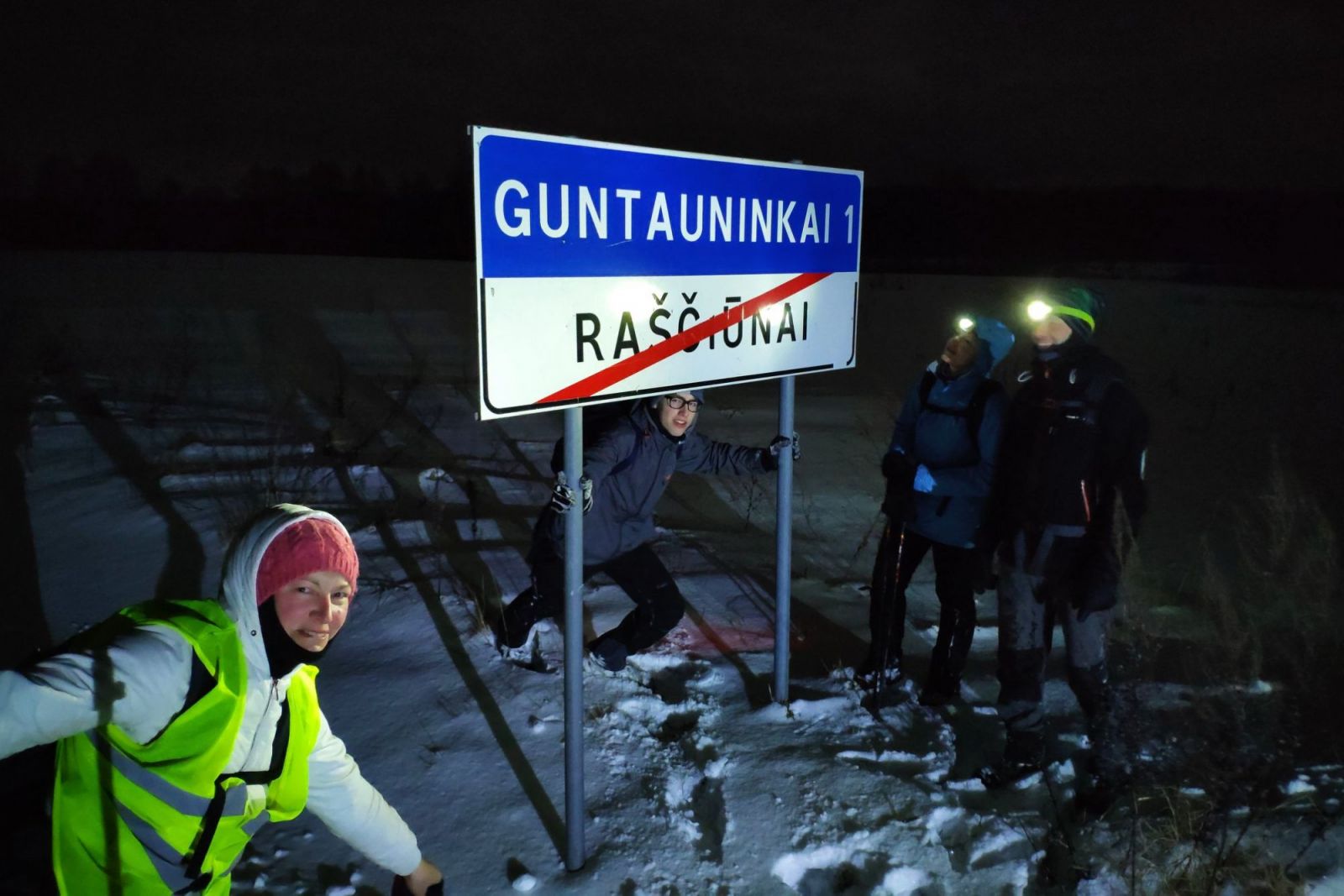 Traukinys su 11 galimai psichiškai nevisai stabilių keliautojų pajuda anksti. Gal dėl to visi išsibarstome po vieną – du visame vagone. Ką gali žinoti, ką anas galvoja :). Jau 7.00 Švenčionėlių stotyje audringai pasitinka palaikymo komanda (net su konkolais). Vadas Dalius instruktuoja ką daryti su gautomis knygomis. Turėsim jas padovanoti sutiktiems žmonėms ir nusifotografuoti. Šoku prie pirmos pamatytos merginos, ką tik išlipusios iš to paties traukinio su kita žygeivių grupe ir atlieku užduotį. Žygio vedlio Remigijaus pamišęs šokis. Lengva jam šokti, ką tik pasikeitus triusikus ir dar su ryškiai žaliomis kelnėmis. Bareikio „pusvalandukas“ ir pajudam į rytmečio tamsą. Po ketvirčio valandos užverda „aušinimo sistema“, karšta, stojame atsikratyti pertekliniais drabužiais. Kyla natūralus klausimas vedliui: „Ar dar toli?“. Tas tyli, šypsosi. Tik vėliau paaiškės, kad prieš akis dar bene 13 valandų ėjimo, bridimo per sniegą, čiužinėjimo ant apledėjusių keliukų, manekeniško žingsniavimo stengiantis tilpti į siauras provėžas, klampojimo po pelkes, laipiojimo per tvoras, balansavimo pratimų ant bebrų užtvankų.