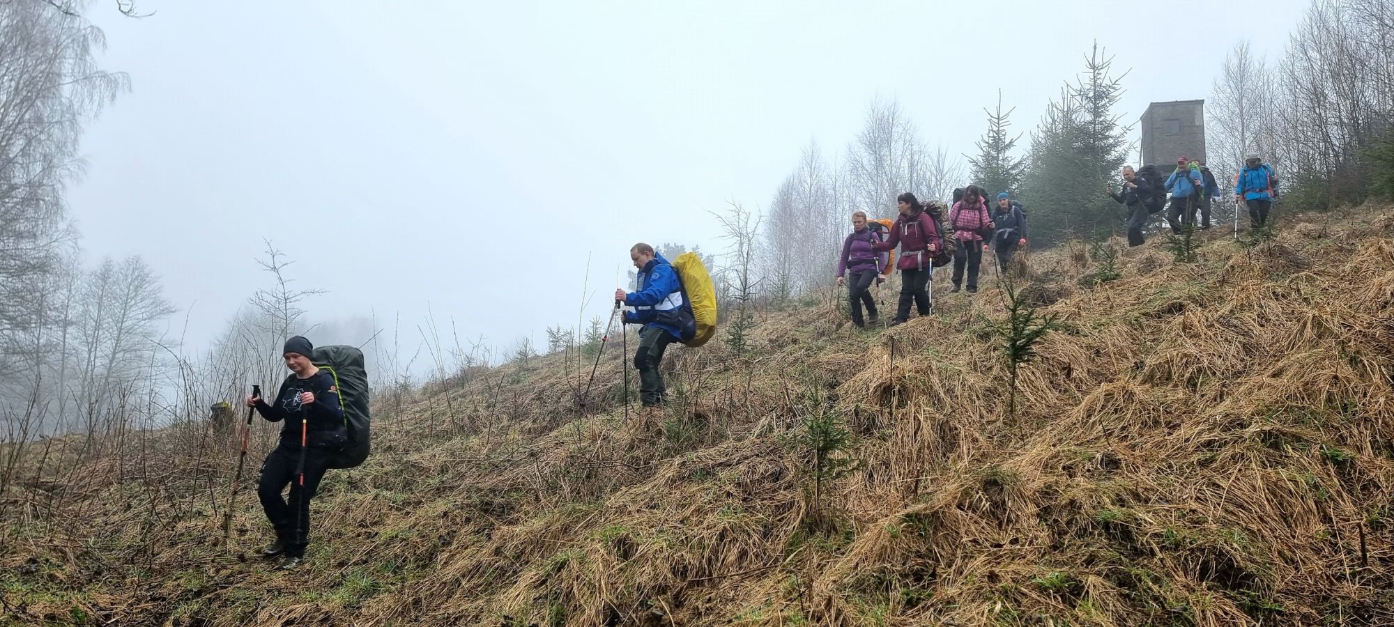 Ūkanotas rytas. Vienoje pusėje pelkė tyvuliuoja, kitoje pusėje miškas sustingęs, o mes pasvirusiame ir sudžiūvusių dagių aptvertame lauke įsikūrę bei drėgname rūke paskendę. Užsikaičiame karšto vandens, lengvai papusryčiaujame, rytinės kavos paskaniaujame ir užsimetę savo „namus“ ant pečių, pajudame kirsti kampą keltąsos kryptimi. Šmėkštelėjo mintis, ar bus išėjimas iš teritorijos, kuri aptverta aukšta vielos tvora? Gal reikėjo pagrįžti ten, iš kur vakar atėjome? Ai, einam, kaip bus taip bus… Dažnai taip mąstome. Ir žiūrėk tu man, patogiausias tarpas be tvoros mūsų laukia ir netrukus įtraukia. Žengiam per ūkanotą jaunuolyną pažliugusiu keliuku. Plotų aptvarai trukdo mums ištiesinti keltąsos kryptį, tenka apeidinėti zigzagais. Matosi, kad čia nemažai medžiotojai tvarkosi. Nemažai šeryklų pristatyta, ir kaip taisyklė medžiotojų būdelė pastatyta. Nepatraukli man ši medžiotojų pramoga, nevertinsiu giliau…
