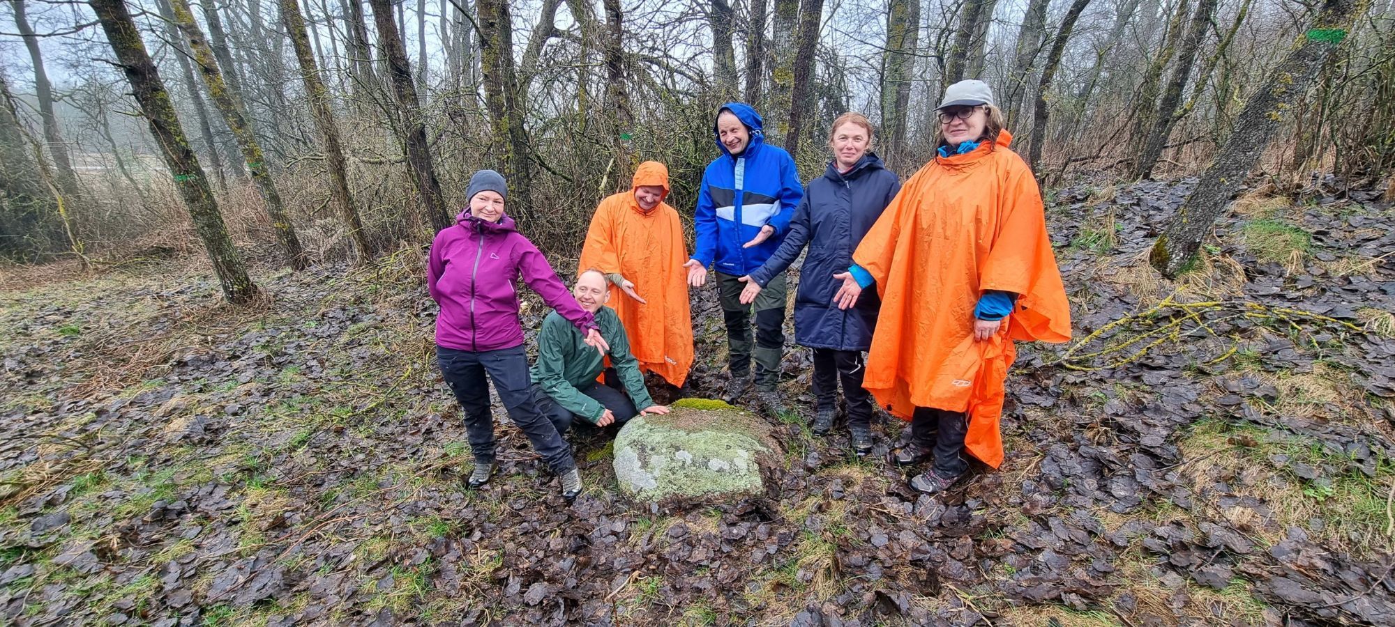 Mūsų kelią kertą asfaltuotas keliukas, kuris nusidriekia į Lenkijos pusę. Nusprendžiame papietauti prie eglynėlio. Netikėtai išlenda trys oranžiniai mūsų žygio bendrakeleiviai, kuriuos praminame morkomis. Viena „morka“ užprotestavo, sako „aš esu mandarinas“. Tai atsirado ir daugiau pavadinimų: tai morka, mandarinas ir apelsinas. Taip draugiškai pasilazdavodami ragavome vieni kitų pietų skanėstus. Žemėlapis nurodo, kad netoli yra senųjų Alksnėnų akmuo su žymėmis. Tai nusprendėme lengvam pasivirškinimui pasivaikščioti be kuprinių ir paieškoti akmens. Radome akmenėlį ir ne vieną, bet sunku buvo įžvelgti kažkokių tai ženklų. Pati vieta nėra įamžinta, tai jeigu ne žemėlapis, tai ir nesuprastum, koks tai objektas…
